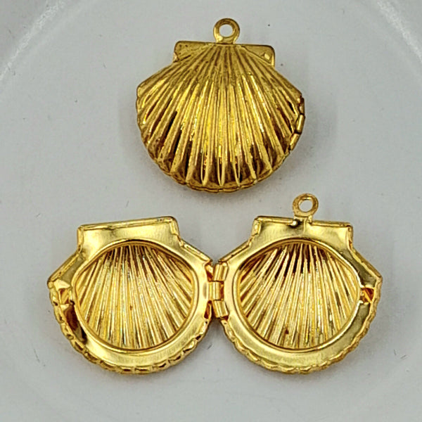 A 24x22x9mm shell shaped locket with hinge. Made of brass that is gold plated, with hole approx 1.5mm in size.